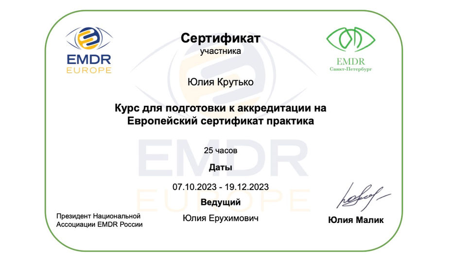 Магистр психологии, EMDR-терапевт и профессиональный супервизор